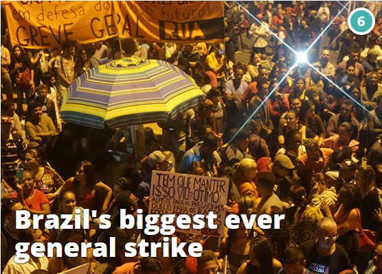 35 million people from Brazil's largest unions and popular movements took to the streets to oppose labour and pension reforms imposed by the deeply unpopular Temer government that won power through a coup. The general strike succeeded in bringing Brazil's biggest cities, São Paulo, Rio de Janeiro, Porto Alegre and Brasilia to a halt and was evidence of growing popular opposition to Temer. (READ MORE)