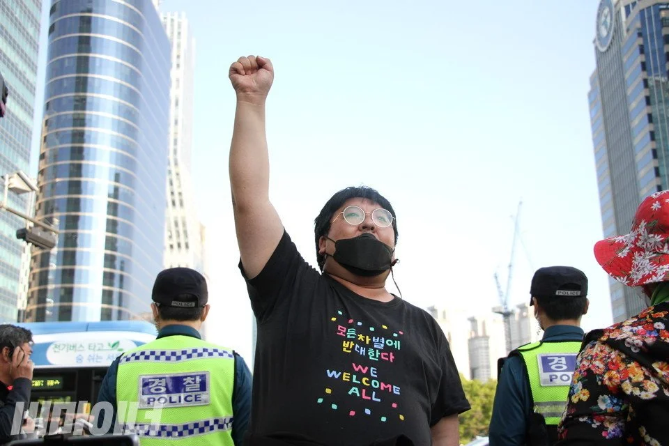(Cheolkyun Park, Organizing Director of Solidarity Against Disability Discrimination (SADD), shouting out slogans at the forefront of the march / Source: BEMINOR)