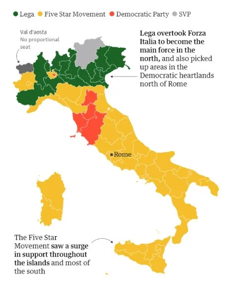 3월 총선 승리 이후 정부를 구성하지 못한 채 혼란스러운 상황이 수개월째 지속되고 있는 상황에서 마침내 정부를 구성하려고 합니다. 마테오 렌치의 민주당은 유럽 의회선거에서 41 %를 득표했지만 3 월 4 일 총선에서 득표율이 18 %로 떨어져 확실히 패배했습니다. 이탈리아는 의회 공화국이기 때문에 총선이 가장 중요합니다. 오성운동은 타정당 대비 거의 두 배에 달하는 득표율로 단일정당으로는 최고 득표율(32.7%)을 기록했으며 그 뒤를 민주당(18.7%)이, 세 번째는 마테오 살비니의 동맹당(17.4%)이 차지했습니다.