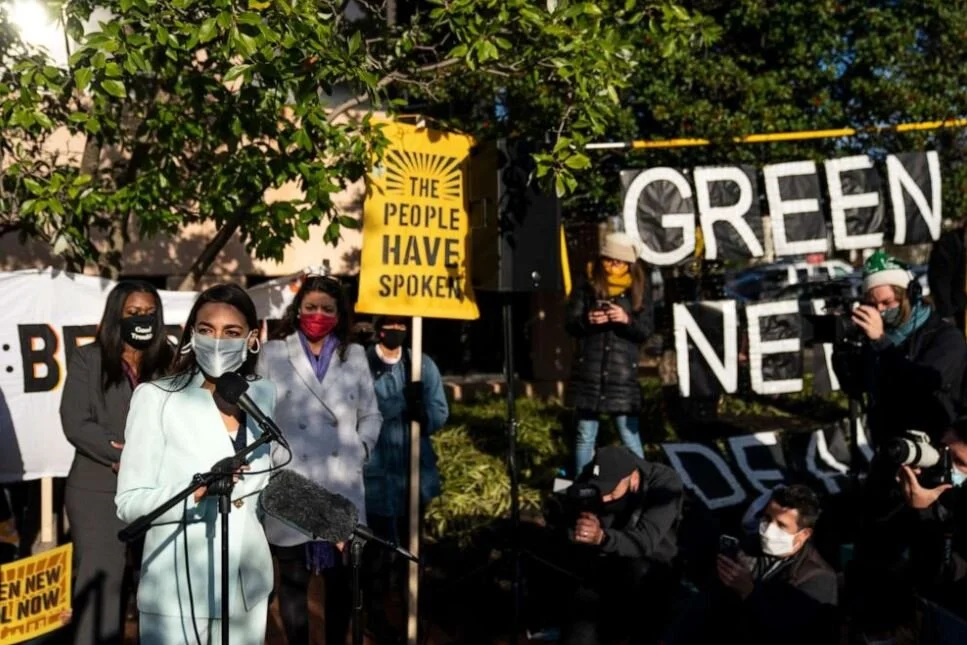 2020년 11월 19일 알렉산드리아 오카시오 코르테즈 하원의원이 민주당전국위원회 앞에서 그린뉴딜을 지지하고 시행할 것을 바이든에게 요구하고 있다. 출처: abcNEWS