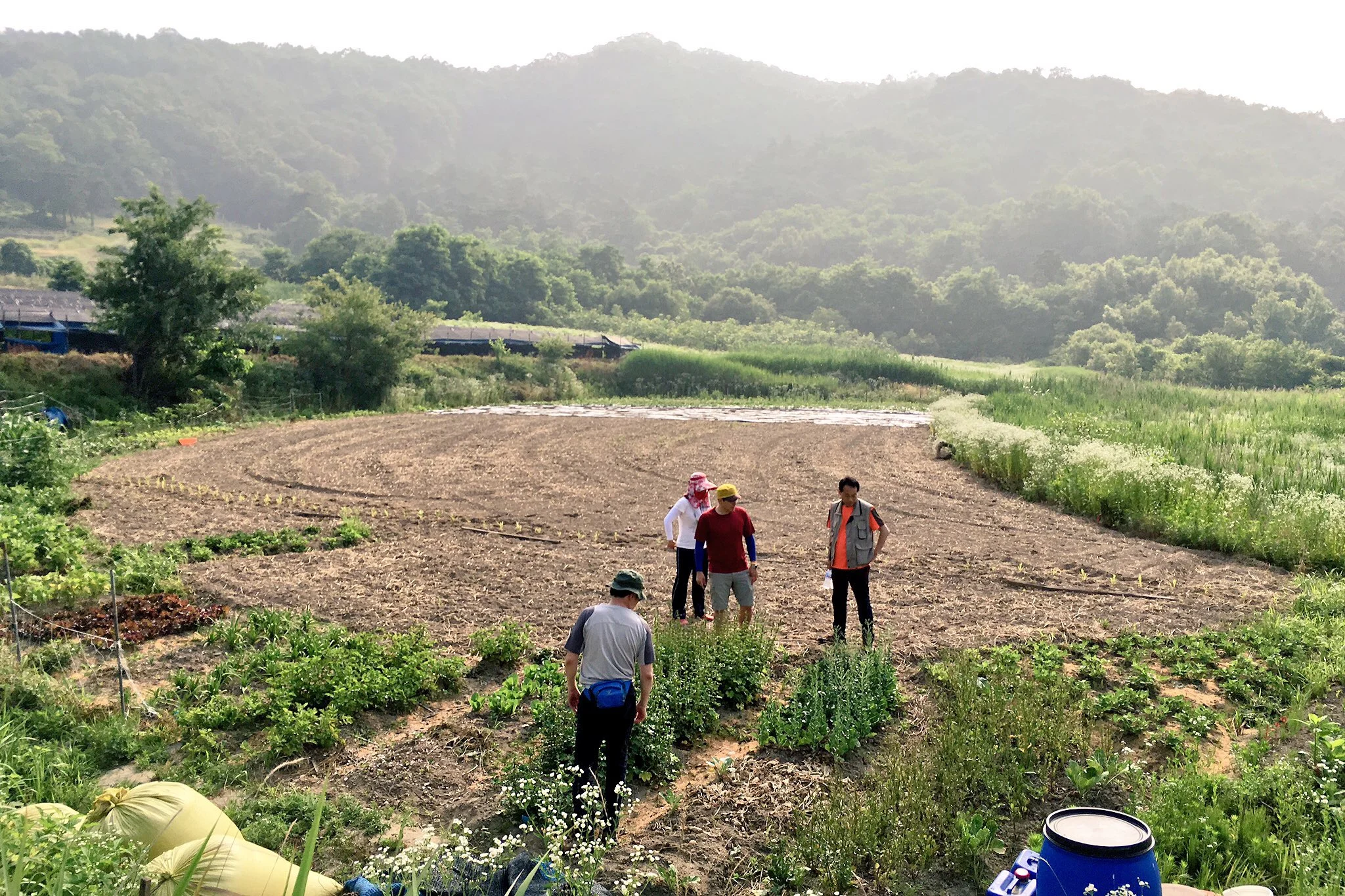 다음날 아침 류화영 농민이 다양한 작물을 실험하고 있는 작은 밭으로 향했다. 크지 않은 밭은 산 아래 있었고 뜻밖의 자연의 선물처럼 산에서부터 흐르는 물줄기가 닿아 있었다.