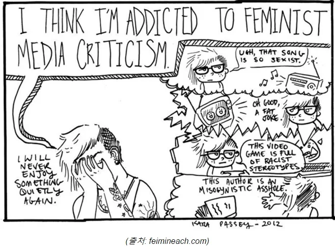 국제전략센터 여성주의 소모임은 위의 광고와 TV 프로그램 두 가지 매체를 대상으로 미디어 모니터링을 진행했다. 모르는 게 약이라는 말이 있다면, 미디어 모니터링은 그 반대의 경우에 해당한다. 너무 많이 알게 되어 힘들어지는 것을 보여주기 위해, 우리 모임의 구성원 중 한 명은 소모임 카톡방에 한 여자에 대한 만화를 올렸다. 페미니즘적 미디어 비평을 진행한 이후, 더 이상 아무것도 마냥 즐길 수 없게 되어, 손에 얼굴을 묻고 괴로워하고 있는 모습이었다. 실제로 2주간 진행된 페미니즘 이론서 공부와 미디어 모니터링을 통해 그 동안 당연하다고 여겼던 “아름다움”이라는 관념과 이러한 미의 관념을 구성하는 데 들어가는 노력과 고통, 통제를 지속해 왔던 나의 역할에 문제의식을 가지게 되었다.