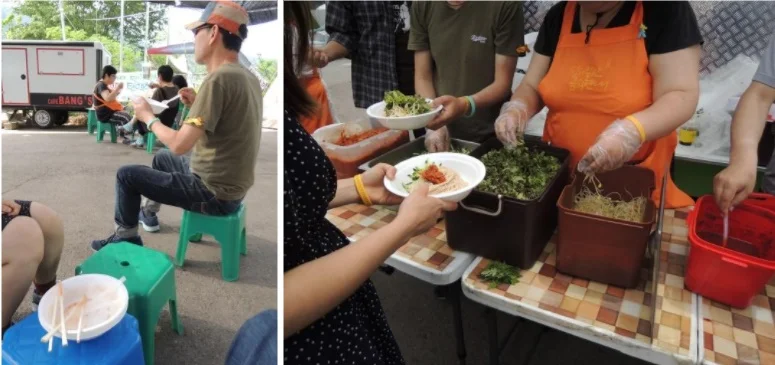 “숙취에는 콩나물국이 최고” (왼) “오늘 점심은 비빔국수입니다. 여러분들을 여기 계속 붙잡아두려고 이제부터 일주일 치 식단을 얘기해 주려고요.”(오)